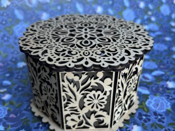 Laser-cut christmas ornaments in a box, 4 different pieces. The ornaments are made of 3 mm birch veneer, ornament measurements are 5×6,5 cm. The box is made of veneered plywood, measurements 6x6x3 cm, finished with linseed oil.